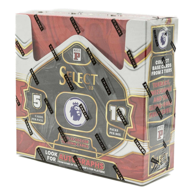 Panini Select återvänder till fotbollen med en Premier League-utgåva för säsongen 2022-23! Denna exklusiva box innehåller 12 paket med 5 kort per paket och erbjuder en 250-korts basuppsättning i tre nivåer: Terrace, Mezzanine och Field Level, med ett brett spektrum av paralleller.